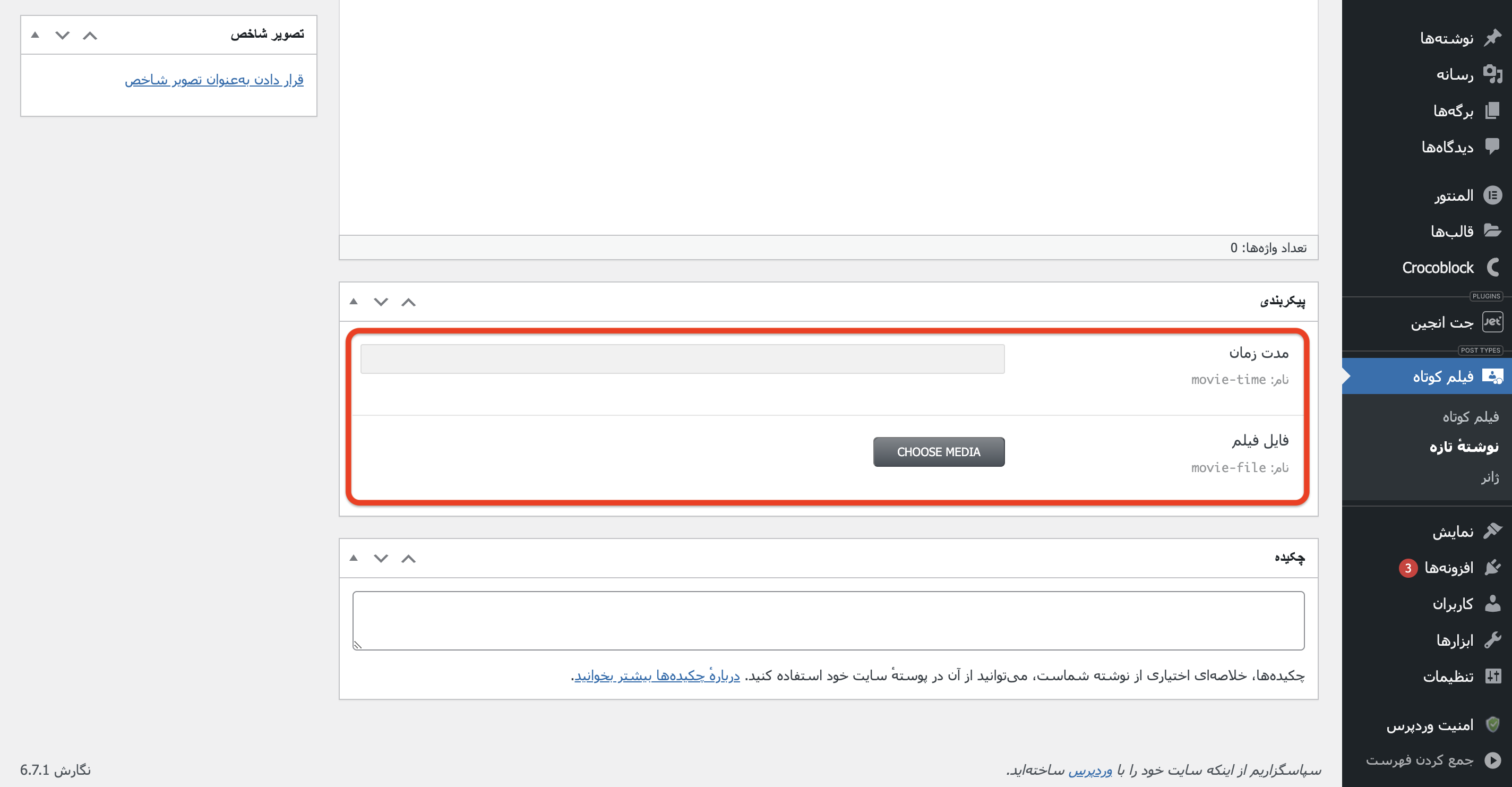 اگر طبق آموزش جلو آمده باشید خواهید دید که علاوه بر فیلدهای پیش فرضی که در تب تنظیمات پیشرفته از قسمت پشتیبانی برای پست تایپ انتخاب کردیم، دو متا فیلد هم اضافه شدهاند و حالا میتوانیم مدت زمان هر فیلم را بنویسیم و فایل فیلم را هم بارگذاری کنیم.